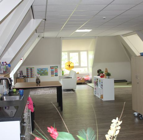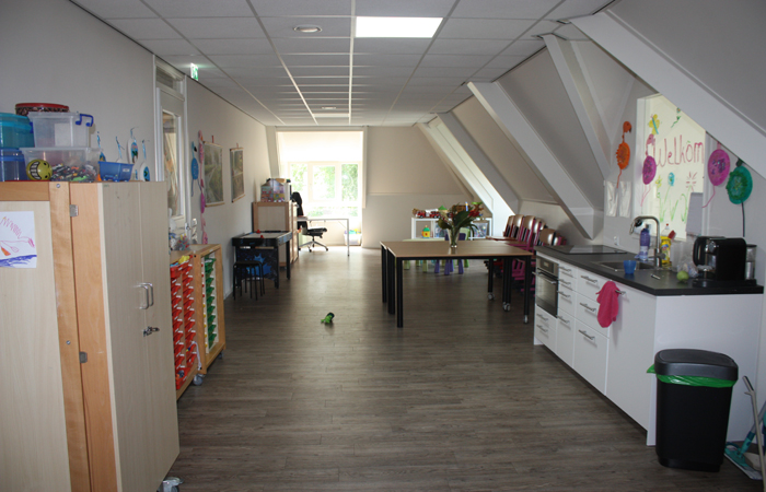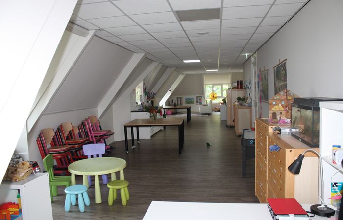 De opvangruimte is groot (120m2) en licht door een aantal grote ramen. En is gezellig aangekleed met mooie nieuwe verhoogde tafels en stoelen en banken. Veilig, ergonomisch en kindvriendelijk. Aan de zijkant is een sanitaire ruimte waarin kinder wc's en wastafeltjes zijn aangebracht. In het midden van de ruimte bevindt zich de keuken en daar tegenover het trapgedeelte naar het Kinderdagverblijf. Ook deze opvangruimte heeft klimaatcontrole gekregen en is goed geventileerd waarbij de sanitaire ruimte extra aandacht heeft gekregen.