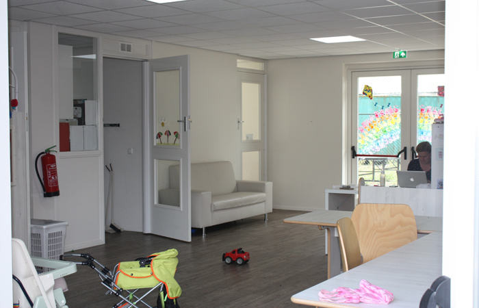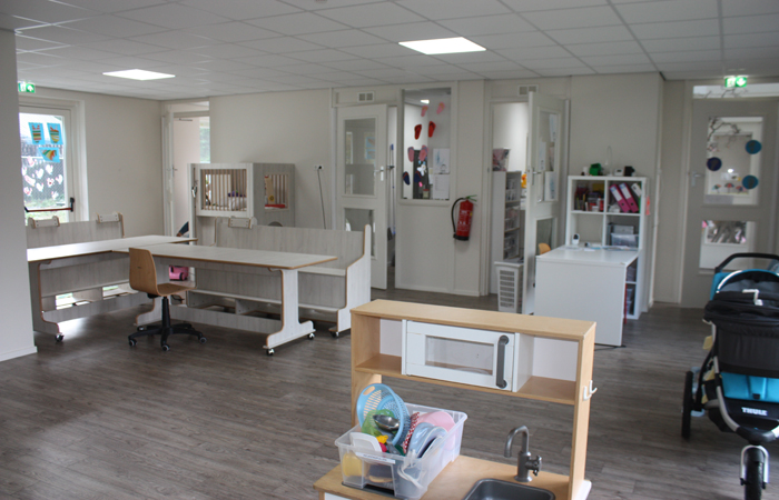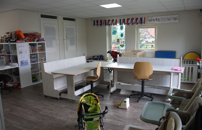De opvangruimten zijn even groot (58m2) en licht - door een aantal grote ramen. En ze zijn gezellig aangekleed met mooie nieuwe houten boxen, verhoogde tafels en banken. Dit alles speciaal ontwikkeld voor kinderdagverblijven. Veilig, ergonomisch en kindvriendelijk. Aan de voor- en achterkant zijn dubbele openslaande deuren aangebracht waardoor de kinderen direct naar buiten kunnen. In het midden van het pand bevindt zich de keuken.